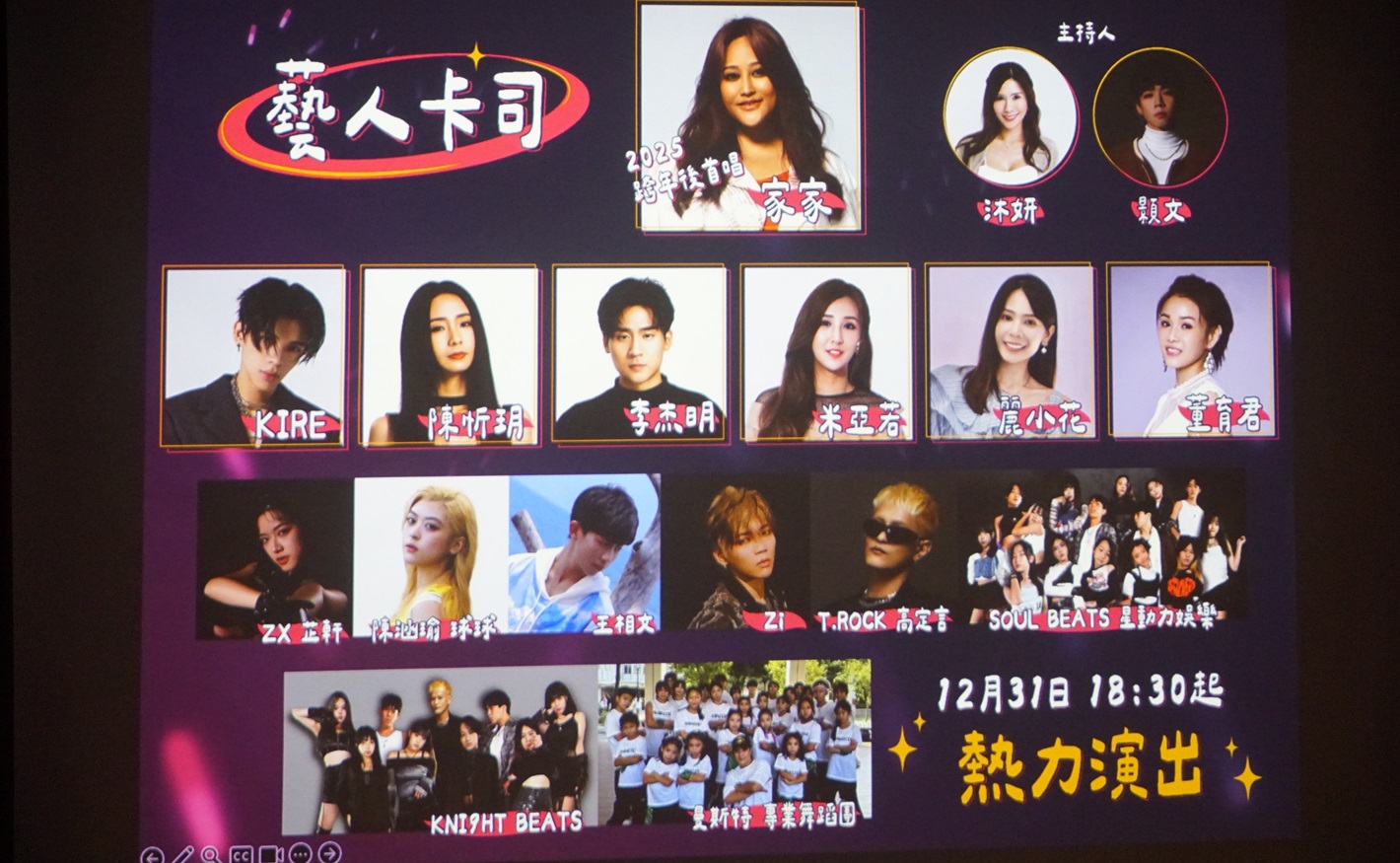 今年的跨年晚會陣容堅強,集合多位人氣歌手與舞蹈團體,包括KIRE凱爾、陳忻玥、李杰明、麗小花及家家,還有曼斯特專業舞蹈團、SOUL BEAT 專業舞蹈團等壓軸演出。主持人 沐妍與顥文將為晚會注入活力。跨年倒數結束後,家家將帶來 2025年首場演唱,為新的一年揭開序幕。