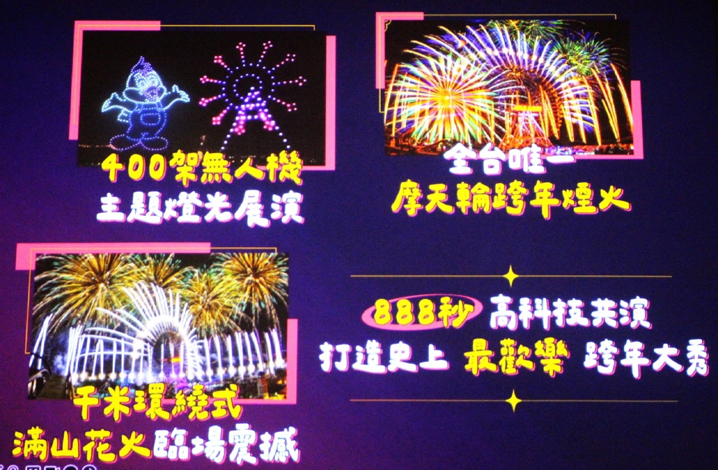 跨年煙火以「超越快樂」為主題,摩天輪主體煙火長達888秒。