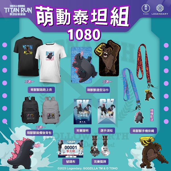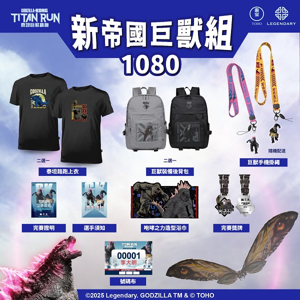 各本次活動提供三大物資組別:有售價1,080元「新帝國巨獸組」、「萌動泰坦組」和售價2,080元「顛峰之戰組」,物資包含:「泰坦路跑上衣」、「巨獸裝備後背包」、「咆哮之力造型浴巾」、「獸獸抱枕毯」、「旅行包」、「棒球帽」等,精心打造獨特的路跑體驗。豪華的組合選擇,每一款物資組合都融合了哥吉拉與金剛的經典元素,從實用到收藏,帶你感受泰坦巨獸的霸氣與力量。