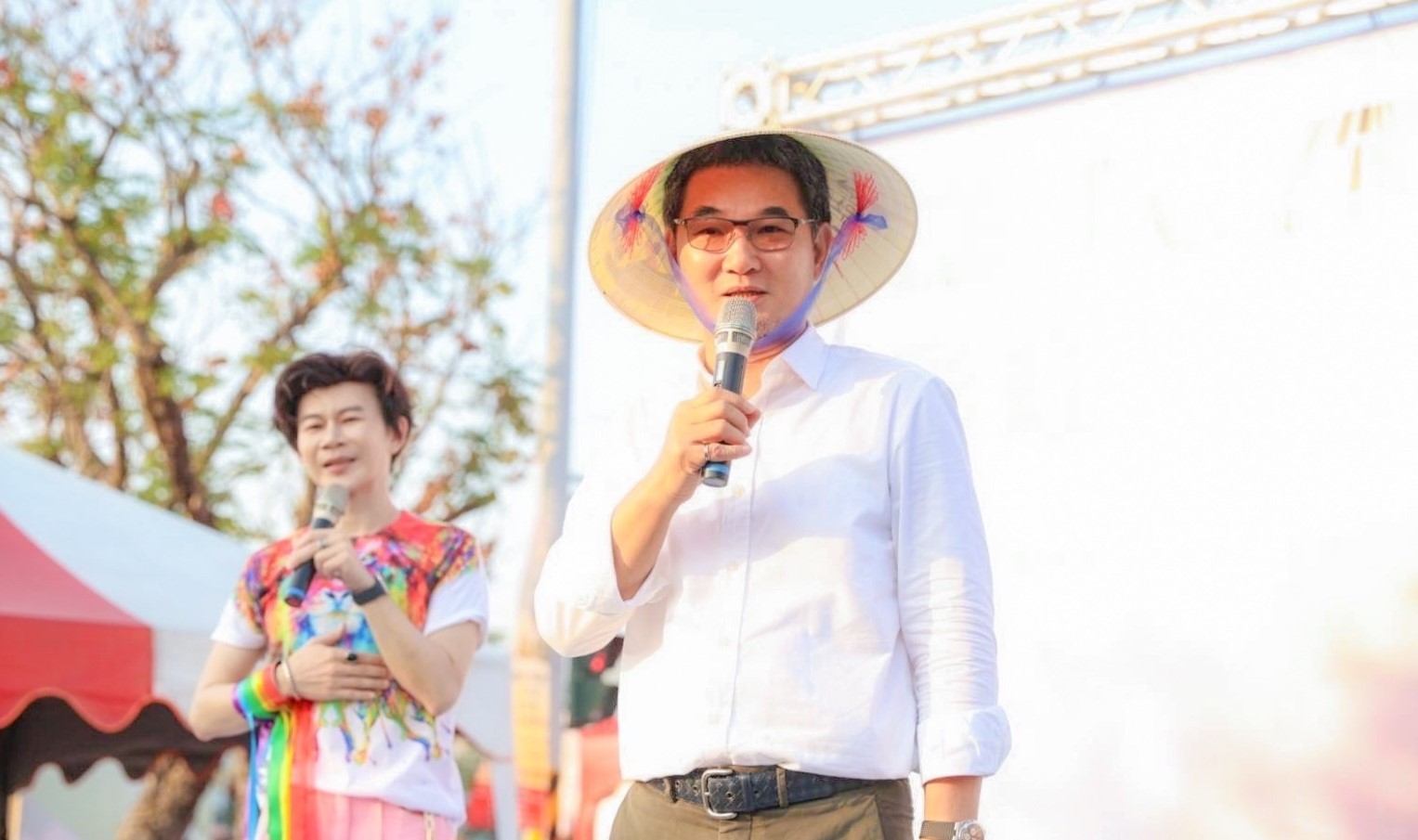 當隊伍走到終點時,劉建國立法委員迎接大家的到來,並開心地上台跟大家說話。(第二屆雲林彩虹遊行團隊提供)