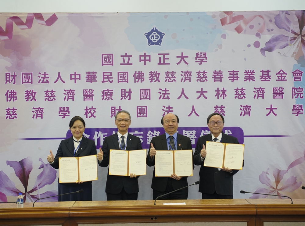 (記者任芳葵嘉義報導)中正大學攜手慈濟開創學術與慈善、醫療和教育志業的合作,於12日由中正大學校長蔡少正、佛教慈濟慈善事業基金會執行長顏博文、大林慈濟醫院院長賴寧生及慈濟大學校長劉怡均正式簽署合作備忘錄,期望透過創造共善、共好,共同培育仁心智慧的優質人才,創造和諧永續的世界而努力,促進學術與公益創新融合,為台灣教育與醫療領域創造新契機。