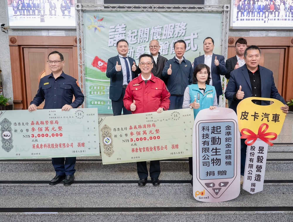 活動中,林建志總經理代表英威康公司,捐贈嘉義縣警察局300萬元,購置蒐證與防護器材;也代表樺康智雲公司再次捐贈嘉義縣消防局300萬元,購置破壞器材與急救器材;昱毅營造公司王瑞麟總經理代表公司則捐贈170萬元給嘉義縣慈善團體聯合協會,購買物資配送之皮卡汽車乙台;起動生物科技公司劉家宏董事長代表公司捐贈血糖機1000台(價值約245萬元)給嘉義縣衛生局。嘉義縣警察局等四個受贈單位,非常感佩捐贈公司發揮大愛的精神慷慨解囊,分別回贈感謝狀致意。張明達議長更期盼藉由今天他們的持續拋磚引玉的善舉,喚起大家議起關懷服務,用愛回饋社會。