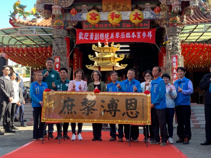 【記者林重鎣台中報導】副總統蕭美琴17日前往台中太平區太和宮祈福,在立委何欣純陪同下,抵達後首和廟方合影後進殿祈福並贈匾「恩溥黎庶」,匾額落款者為前總統蔡英文在卸任前今年三月所贈,適逢520政權交接前國政繁忙,此行由蕭美琴代表贈揭。