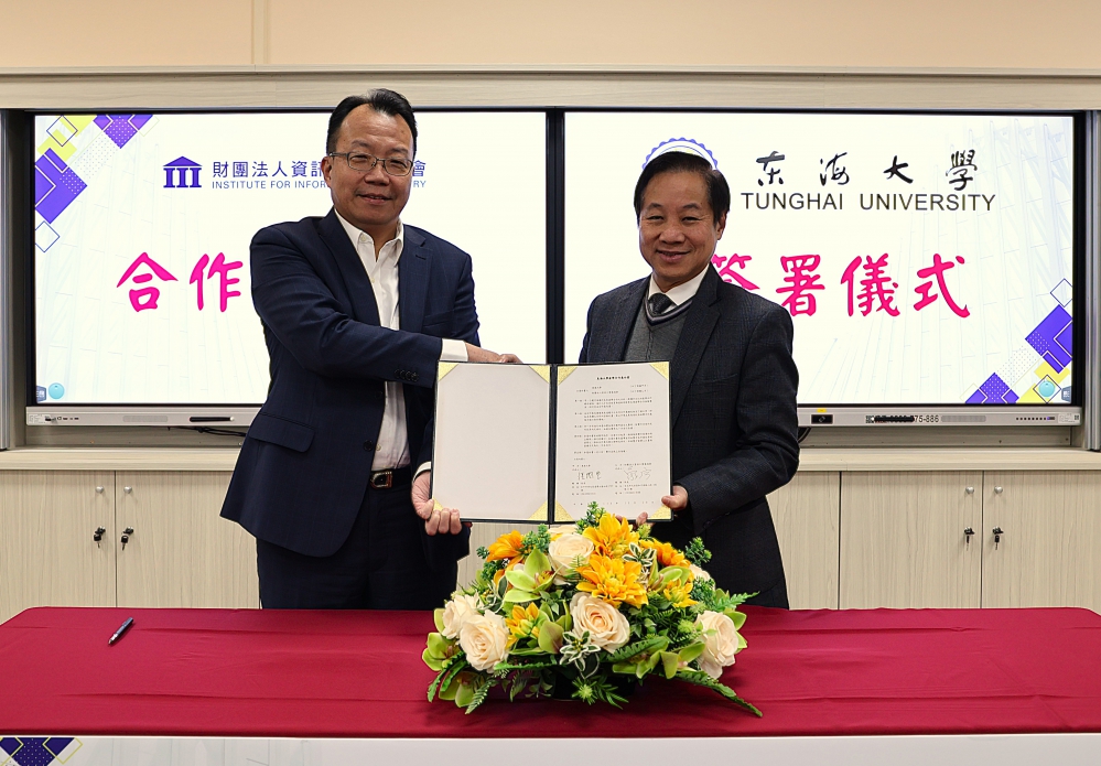 隨著全球人口高齡化以及全球2050年實現碳中和的目標下,東海大學與資策會19日於東海校園內簽署合作備忘錄(MOU),台中市副市長鄭照新、資策會軟體技術研究院長蒙以亨、軟體技術研究院副院長蔡澤銘等人一同到場見證。