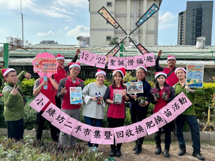 【記者林獻元台中報導】今年聖誕不一樣!台中市政府環保局南屯區清潔隊在隊部門口環境教育園區,以回收的聖誕樹裝置聖誕節意象宣導環保,並於12月22日下午1時30分在南屯區清潔隊舉辦「聖誕惜福趣~小綠坊二手市集暨資源回收換肥換苗活動」,邀市民一起來惜福尋寶、賞樹做回收。