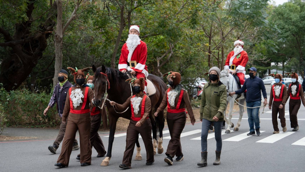 管理學院在19日則提前推出白色聖誕神駒創意,聖誕老公公今年駕起雪橇,由副校長劉正與企管系會長陳淞屏化身聖誕老公公,親自駕馭來自東海牧場的荷蘭俊馬穿越校園到管院,與學生一起點亮聖誕燈火,管理學院院長王凱立、公事處黃兆璽處長也裝扮成聖誕老人,一起在美麗的白雪下,分送500份禮物給同學們。