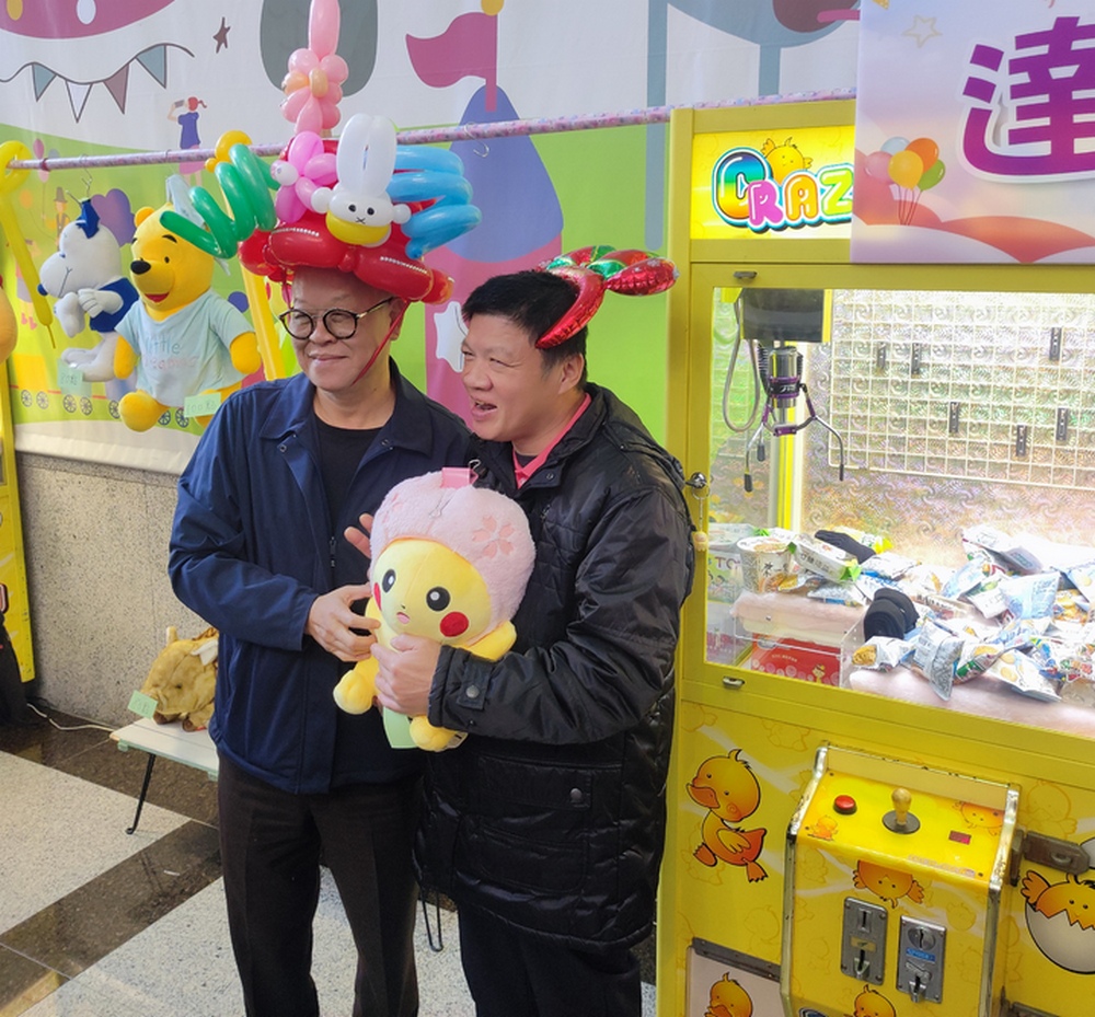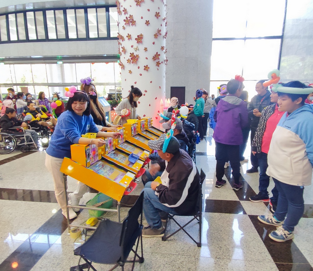 嘉義縣議會照顧弱勢寒冬送暖在大廳設有夾娃娃機、套圈圈、彈珠檯與投籃球機等闖關遊戲設施提供大、小天使使用。(圖/記者任芳葵攝)