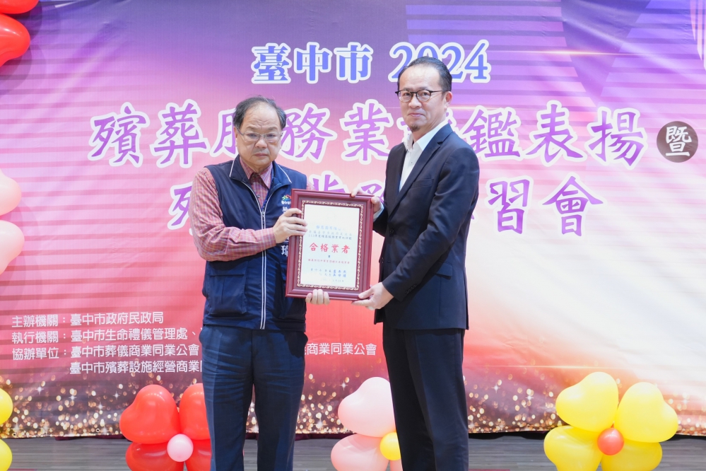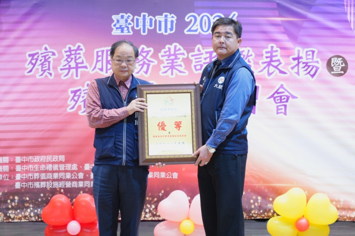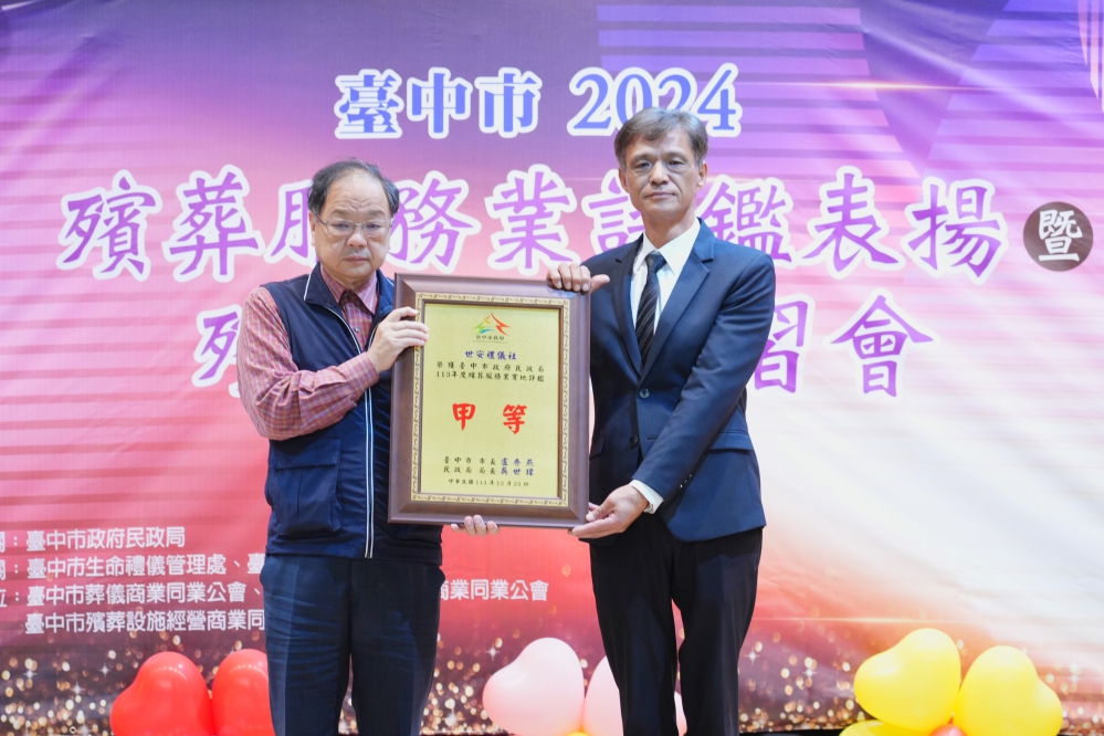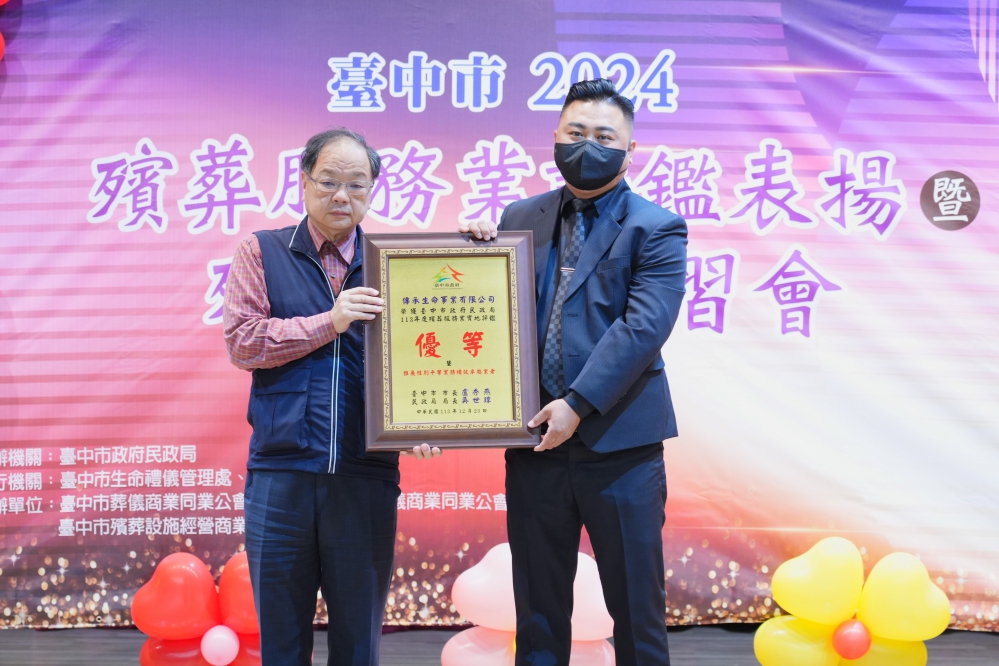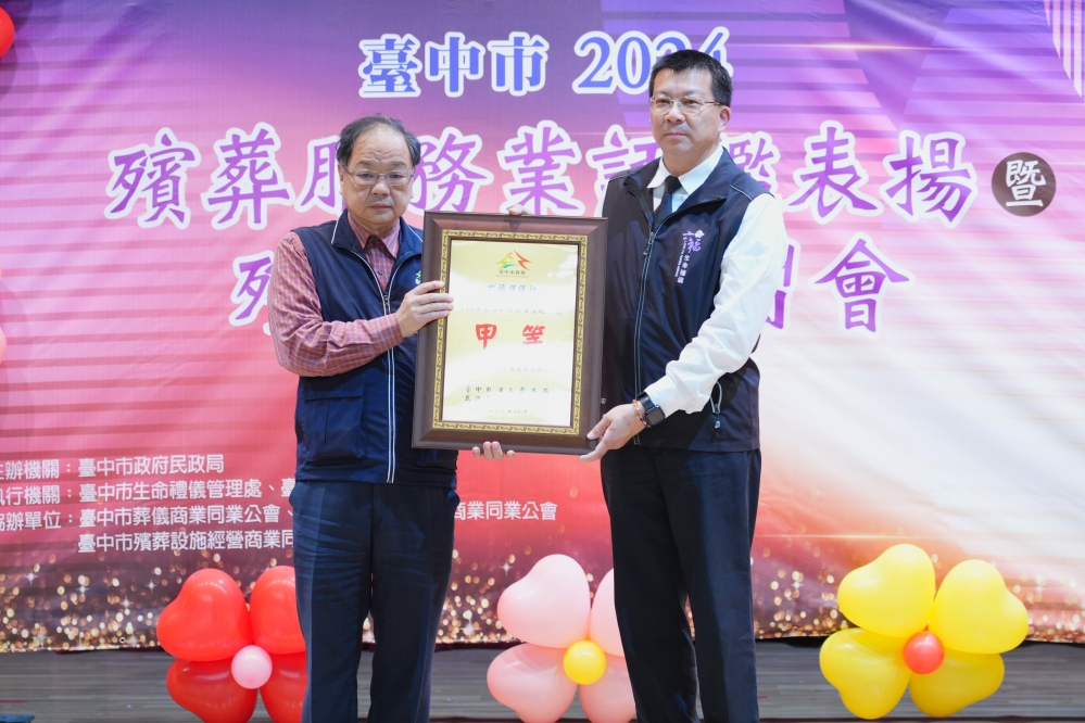 【記者林獻元台中報導】為提升殯葬服務品質,台中市政府每年針對全市合法設立的殯葬服務業者,分三大區城輪流進行評鑑,今年評鑑對象為第二區域23家業者,並評選出3家優等、2家甲等及5家實地評鑑合格業者,23日在南屯區公所舉行表揚典禮暨殯葬業務講習會。台中市民政局長吳世瑋代表出席頒發獎牌,肯定業者對生命事業的努力付出及創新貢獻,並鼓勵業者持續精進,與市府攜手提供家屬最適切的協助。
