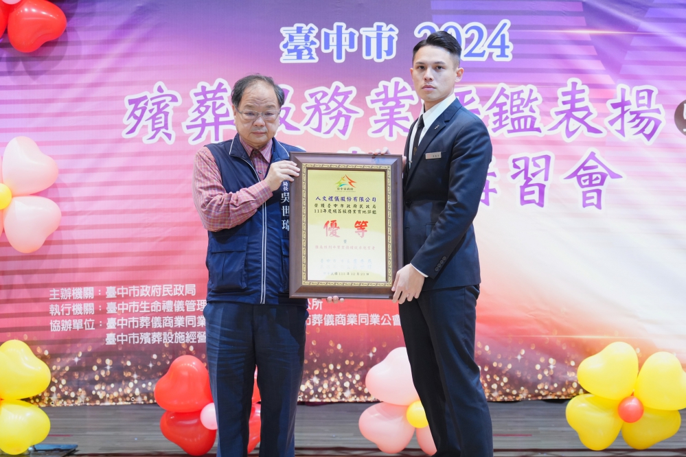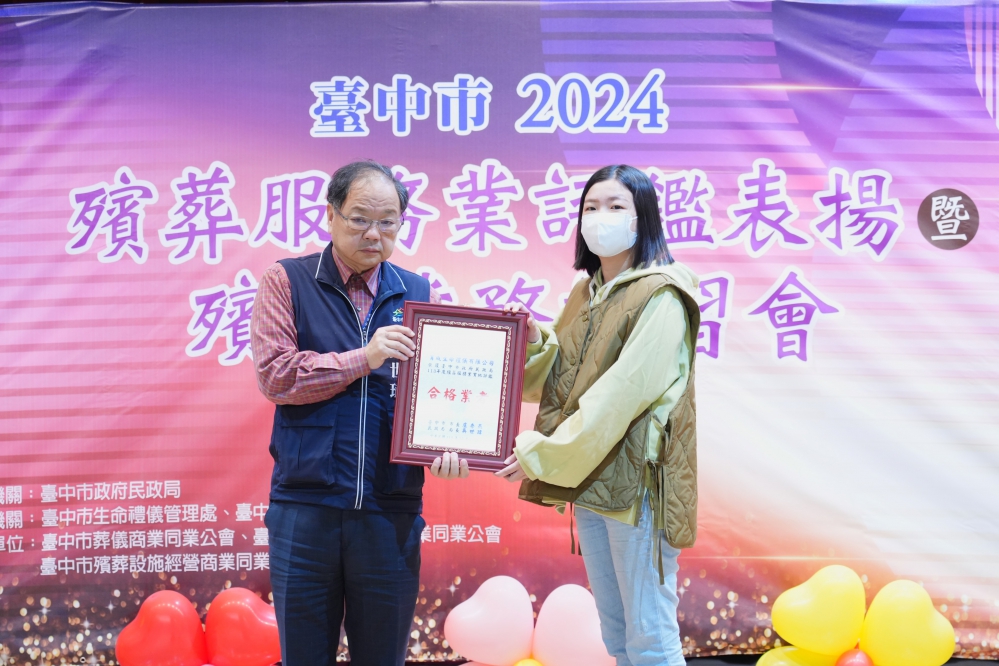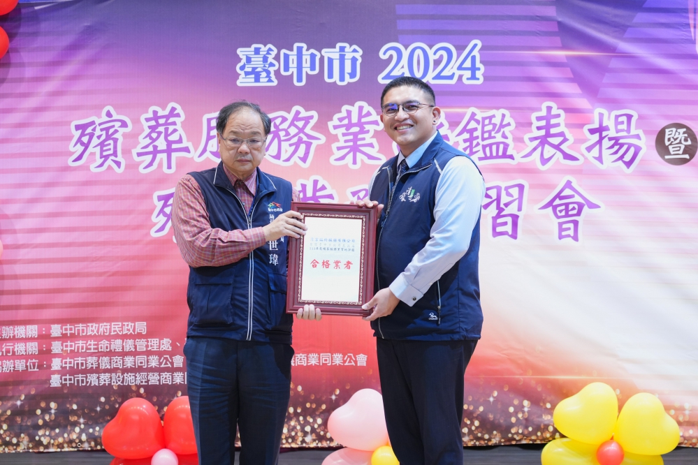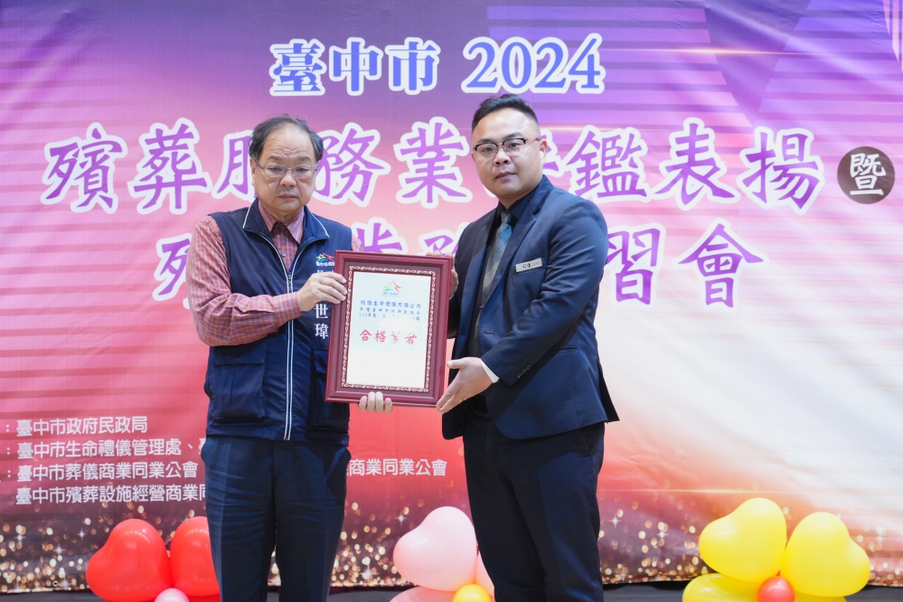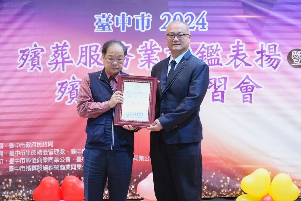 【記者林獻元台中報導】為提升殯葬服務品質,台中市政府每年針對全市合法設立的殯葬服務業者,分三大區城輪流進行評鑑,今年評鑑對象為第二區域23家業者,並評選出3家優等、2家甲等及5家實地評鑑合格業者,23日在南屯區公所舉行表揚典禮暨殯葬業務講習會。台中市民政局長吳世瑋代表出席頒發獎牌,肯定業者對生命事業的努力付出及創新貢獻,並鼓勵業者持續精進,與市府攜手提供家屬最適切的協助。