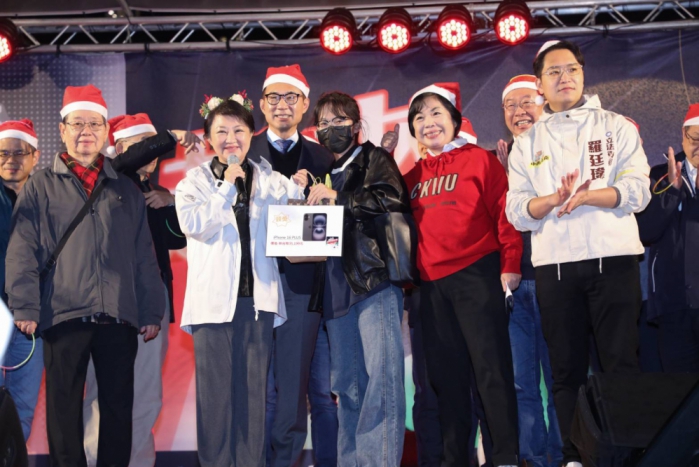民政局說明,盧市長今晚也親自抽出活動頭獎價值約3萬元的iPhone 16 plus,現場氣氛歡樂。此外,晚會活動壓軸由1004位聖誕老公公帶著平安與祝福前往鄰近百貨商場、社區鄰里報佳音,透過歌曲與發送糖果、聖誕卡等小禮物,將聖誕氣氛與祝福傳遍城市各個角落。