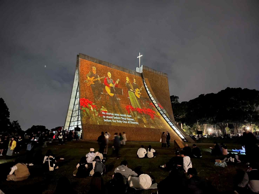 今年的聖誕夜是路思義教堂重啟後首次舉行聖誕夜禮拜,牧師陳尚仁以「以基督的心為心」為主題,透過莊嚴的儀式傳遞信仰力量。更值得一提的是,今年首次推出的夜間外牆投影,將經典聖誕故事與絢麗的影像投影在教堂外牆上,彷彿將教堂變為一座戶外電影院。