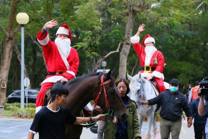 東海今年的聖誕節可說格外繽紛,從24日傍晚入夜前就已經熱鬧滾滾,校長張國恩化身聖誕老人,與企管系會長陳淞屏一同自路思義教堂上馬騎乘,穿越熱鬧的聖誕市集,最終抵達人文大樓前,親手為學生們送上聖誕禮物。這場特別的驚喜引發全場熱烈歡呼,張國恩感性地表示,聖誕節不僅是歡慶的日子,更是分享愛與感恩的重要時刻。希望這份聖誕祝福能溫暖每一位師生的心。