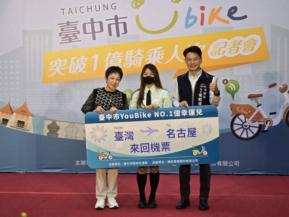 【記者林獻元台中報導】億騎同樂!臺中市公共自行車系統自103年啟用,不僅深受市民喜愛,更已成為綠色交通的象徵與驕傲。市府交通局113年12月8日宣布,臺中市YouBike的累計騎乘人次正式突破1億人次!為慶祝共享運具的新里程碑,特別於26日舉辦記者會,與微笑單車股份有限公司及各界代表共同分享這份喜悅。騎乘第1億人次的幸運兒是名學生,到場領取日本名古屋雙人來回機票,高興的表示很幸運,她常在高工路YouBike站借車,是迎接新年最棒的禮物。