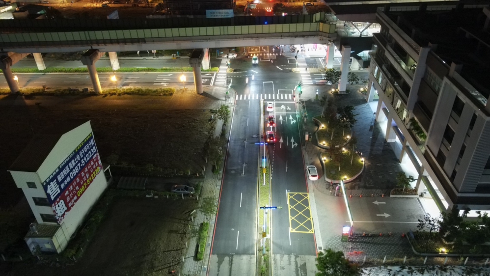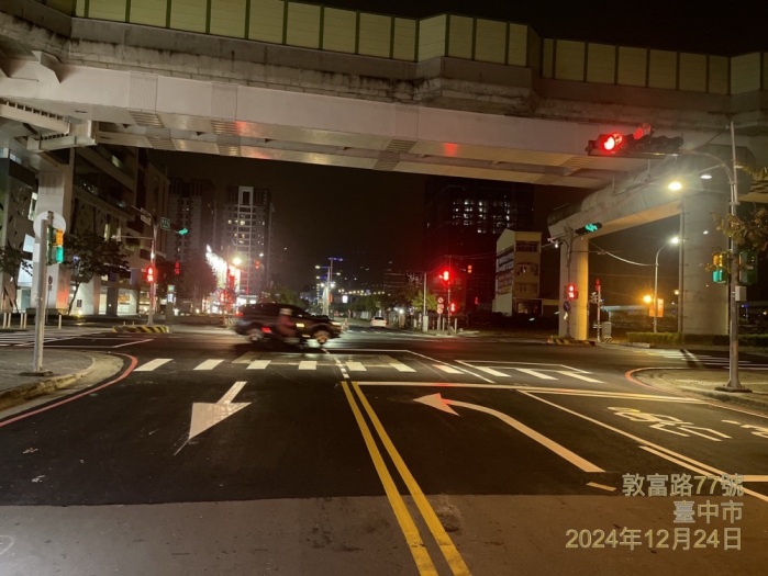例如北屯區松竹路與敦富路口,臨近舊社捷運站、好市多大賣場及總站夜市,交通局優化路口行人動線環境,改善無障礙斜坡道、庇護島、施作行穿線退縮,建置放大型行人燈、行人早開時相,另考量車流動線,也增設左轉偏心車道。