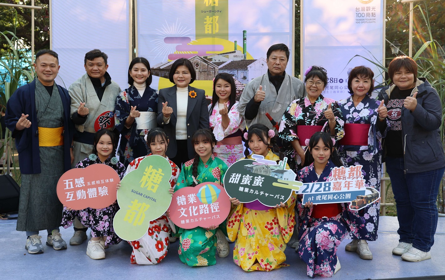 活動內容豐富多元,文化觀光處處長陳璧君指出,虎尾「糖都嘉年華」融入濃厚的日式祭典氛圍,特設五感互動體驗區,包括和服穿搭、糖製品試吃、闖關遊戲等。參加者完成糖都三關卡後,還可拍照打卡兌換虎尾糖或甘蔗飲品,增添互動樂趣。現場的五分車更成為最佳拍照景點,載滿甘蔗的車廂在鐵道上穿梭,帶給人濃厚的懷舊氛圍。