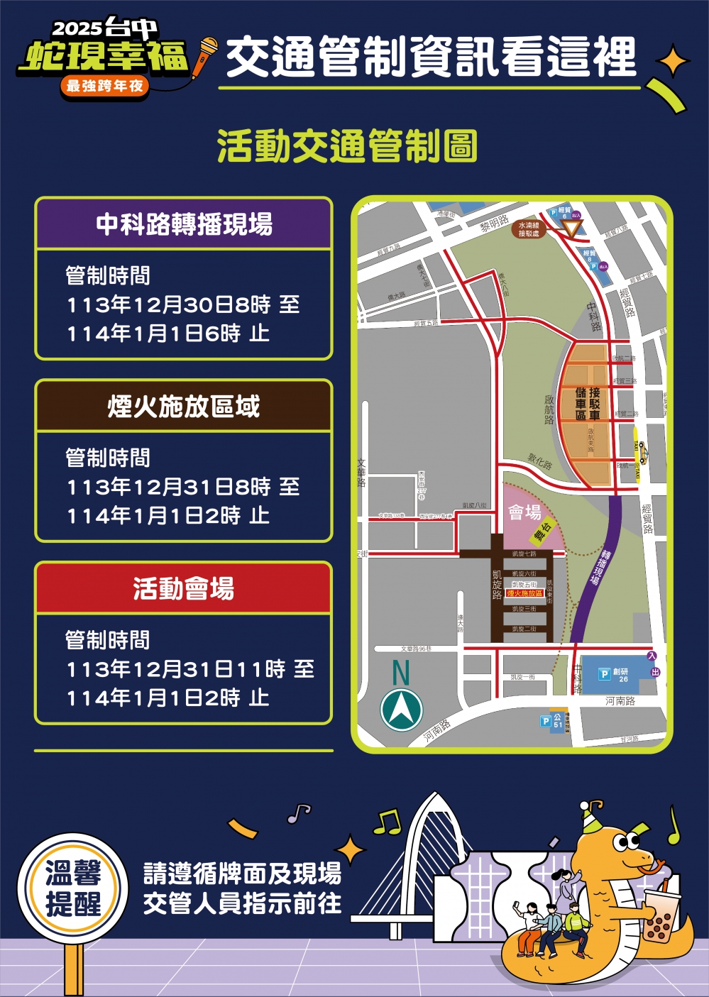 跨年晚會活動當天,周邊道路將實施交通管制,交通局籲請民眾提前規劃行程,改道避開管制路段,會場周邊將進行三階段道路管制,禁止一般車輛進入。第一階段自12月30日上午8時至翌年1月1日早上6時,針對中科路(敦化路至大鵬路)進行封閉,以配合轉播設備撤收作業;第二階段則從12月31日早上8時至1月1日凌晨2時,封閉煙火施放區,包含凱旋路(經貿五路至大鵬路)、凱旋七路及凱旋六街等路段;第三階段自12月31日中午11時至1月1日凌晨2時,全面管制會場周邊主要道路,包括凱旋路、敦化路及大鵬路等,詳細管制資訊可參考交通局提供的圖示指引。