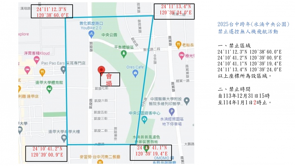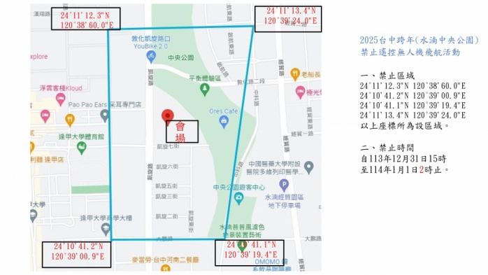 葉昭甫提到,為確保活動安全,中央公園部分空域自12月31日下午3時至1月1日凌晨2時,禁止遙控無人機活動,呼籲相關玩家遵守管理規定。此外,部分公車路線將因應交通管制暫停停靠,部分YouBike站點將暫停營運,包括「經貿五僑大八街口站」、「觸覺體驗區(經貿五路)站」、「自我體驗區(僑大八街)站」、「敦化凱旋路口站」及「中央公園(遊客服務中心)站」等,建議民眾改利用周邊其他站點。