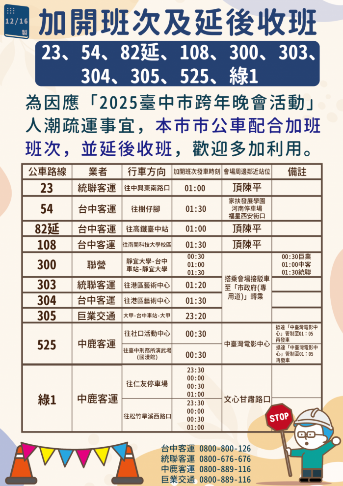 葉昭甫提醒,捷運及接駁車是最方便的選擇,活動當天捷運營運時間將延長至凌晨2時,並於沿線設置人行專用通道連接會場,市府也提供三條免費接駁路線,協調市區公車業者延後收班,歡迎民眾多加利用大眾運輸工具,一起來台中倒數迎接蛇年的到來!