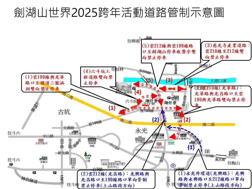 (2)雲212線(光昌路):光昌路與光華路口至光昌路與雲199線路口上山路段禁止停車;光昌路與雲199線路口至劍湖山收票口處雙向禁止停車。