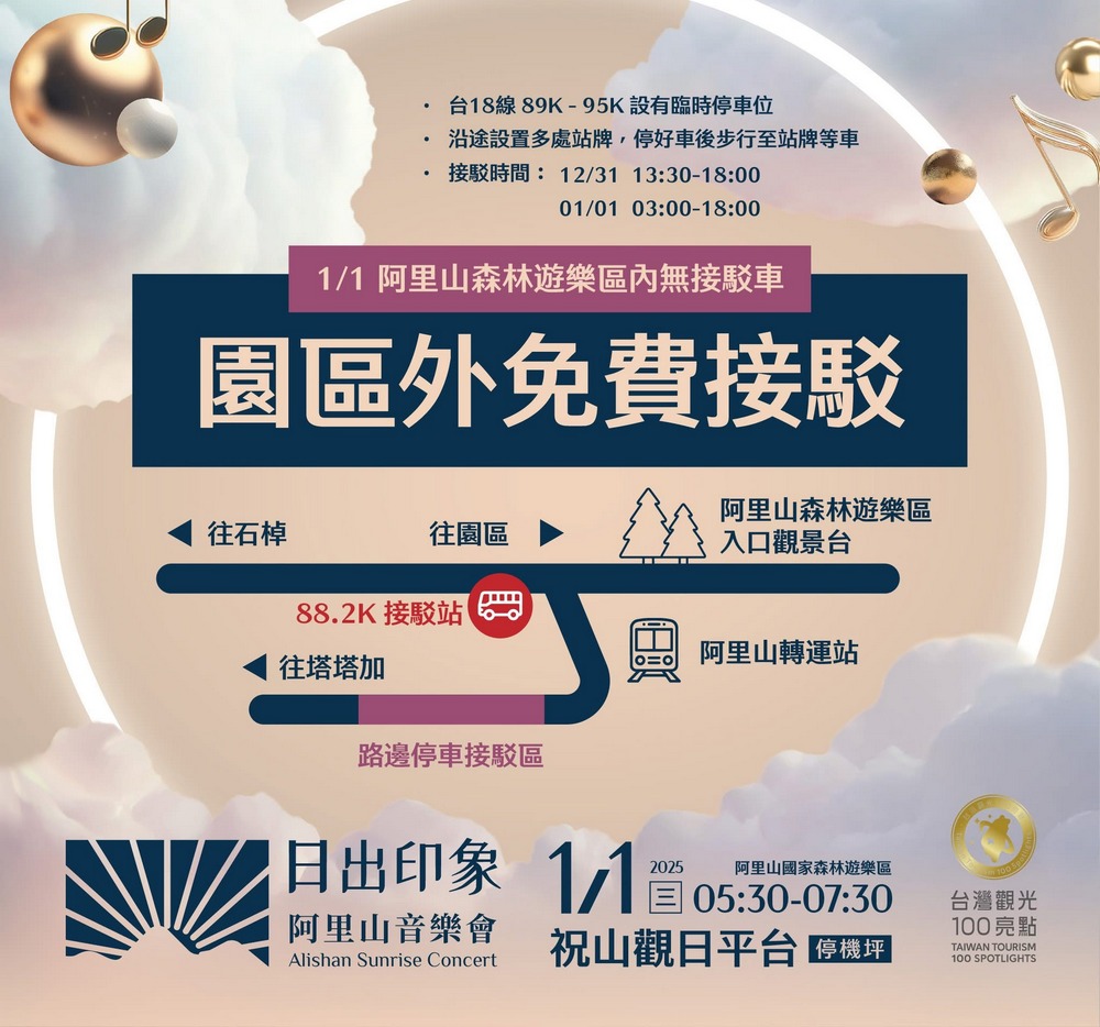 縣警局說明疏導措施:(一)小型車:請行駛過台18線88.2公里園區大門往塔塔加方向路旁臨時停車格停車,林管處於該日3至18時規劃免費接駁台18線89至95公里停車之遊客至阿里山遊樂區入口。(二)遊覽車等大型車輛:在大型車迴轉場下客後,立即駛出園區停放台18線往嘉義市(下山)方向之路旁停車位。(三)機車:不可入園,須停放園區外台18線往嘉義市(下山)方向,再步行至入口處購票入園。(四)車輛請於上山前,在平地加滿油,並檢查機件性能;另台18線阿里山公路蜿蜒曲折,切勿跨越雙黃線行駛,並注意減速慢行。(五)參加日出活動後,請駕駛人稍事休息養足精神再下山,以免疲勞駕駛,影響行車安全。(六)為紓解下山車潮,1月1日8時至14時將在台18線39.4K管制上山車輛進入嘉130線,僅提供下山之車輛於台18線56.7公里處進入單向通行。為維護跨年連夜上山車輛行駛安全,警方特於台18線阿里山公路沿線多雨霧及危險彎道等路段佈設爆閃警示燈,提醒駕駛人注意安全;另也呼籲上、下山車輛務必減速慢行,保持安全距離,切勿疲勞駕駛,請駕駛人審慎評估自身體力再出發,以免發生事故,影響通行。