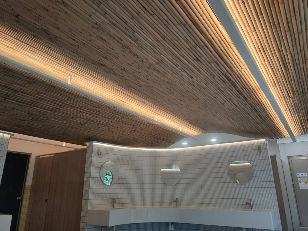 去年先開放使用的遊客中心下方公廁「迎竹軒」,以波浪弧型竹天花形塑,呈現竹藝的柔軟,從戶外斜射的柔和光線,使整體氛圍融入環境,保有隱私也保持空氣流動性,呈現具自然特色的場域;綠色走廊上方「沐竹軒」公廁,則以國產竹材孟宗竹桁架構築成半開放式屋頂,單斜面結構和透光中空板,減少重量並引入日光,打破既有公廁的設計及印象,深獲遊客好評。