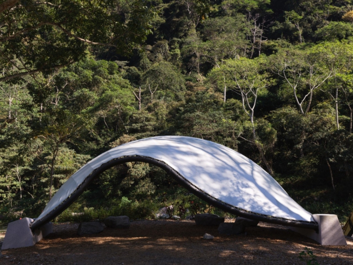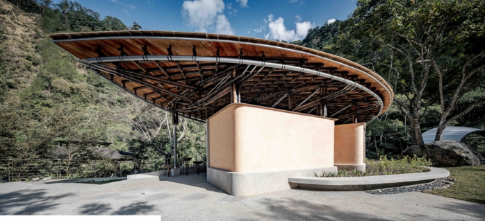 八仙山國家森林遊樂區在十文溪邊的「浮竹軒」公廁,以竹桁架屋頂構築如葉子般輕盈的漂浮感,四周出挑的造型,創造半戶外空間,達到穩定的竹構美學。(記者張原銘攝)