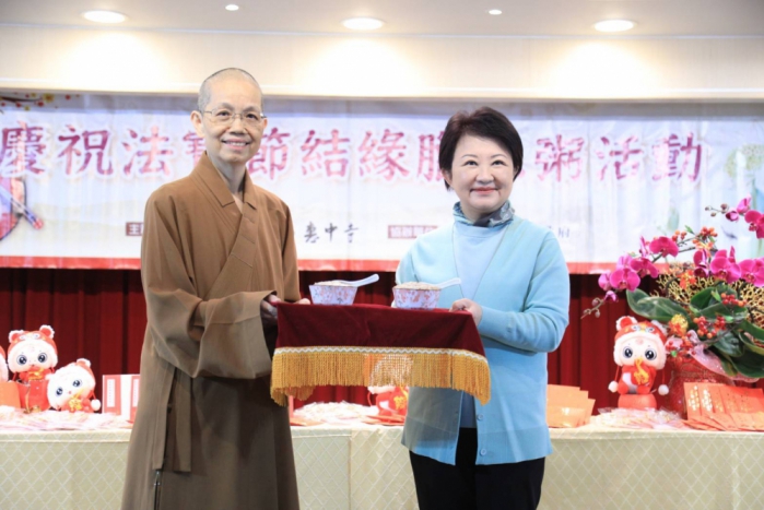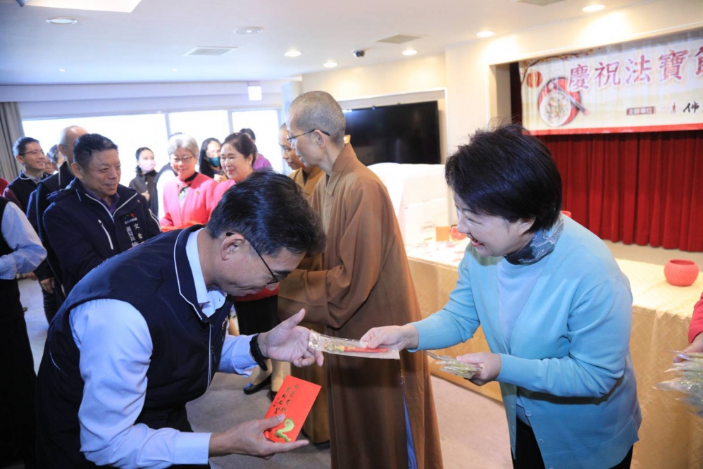【記者張原銘、張皓傑台中報導】佛光山惠中寺為感謝台中市府團隊長期以來對市政推動的努力,7日上午11時在台灣大道市政大樓惠中樓9樓台中廳舉辦「佛光山惠中寺慶祝法寶節結緣臘八粥活動」贈粥儀式,台中市長盧秀燕代表市府感謝寺方準備數千碗美味的臘八粥、春聯及蛇年紅包致贈市府員工,傳遞愛與祝福。