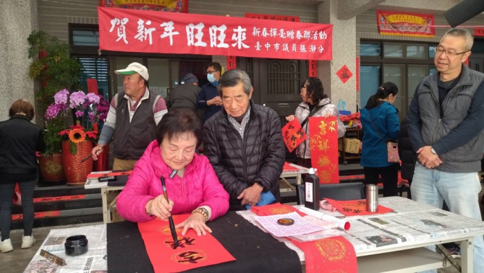 這場新春揮毫贈春聯活動,邀請台中市葫蘆墩書畫促進協會創會長林俞君及趙令熙、楊潮滄、王熙元、陳大洋、張秀霞、曾淑貞等書法老師免費幫民眾寫春聯。