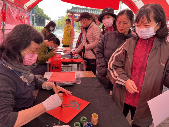 【記者林獻元台中報導】歲末迎春賀新年,台中市東區東興里辦公處11日在南門福神祠,舉辦現場揮毫寫春聯、送春聯活動,除書法老師寫的外,還可以客製化專屬的特色春聯,雖然天氣寒冷,仍湧入大批排隊人潮,熱鬧滾滾。