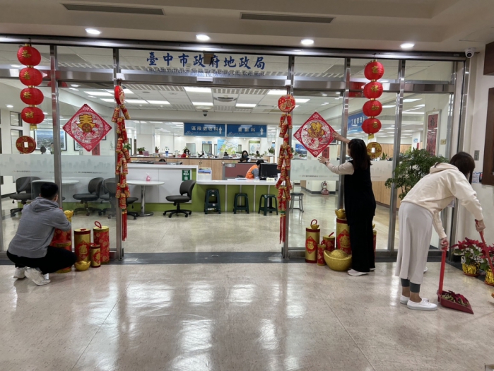 【記者林獻元台中報導】農曆春節即將到來,台中市政府地政局為響應「台中清潔月逗陣來拼厝」活動,於10日為地政局清潔日,由全體同仁進行環境清潔工作並佈置春節飾品美化辦公場域,齊心為辦公環境除舊布新大掃除,乾淨迎新春。