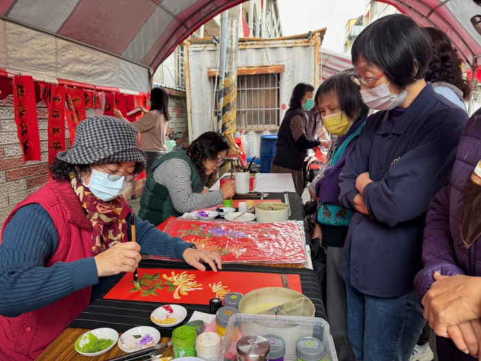 這場活動,15日在國光里瑞豐街福正宮土地公廟前舉行,福正宮管委會主委曾再富、副主委前市議員邱素貞,以及市議員陳雅惠等人也到場感謝書法老師辛勞,並祝賀民眾新年快樂,氣氛熱絡、溫馨。