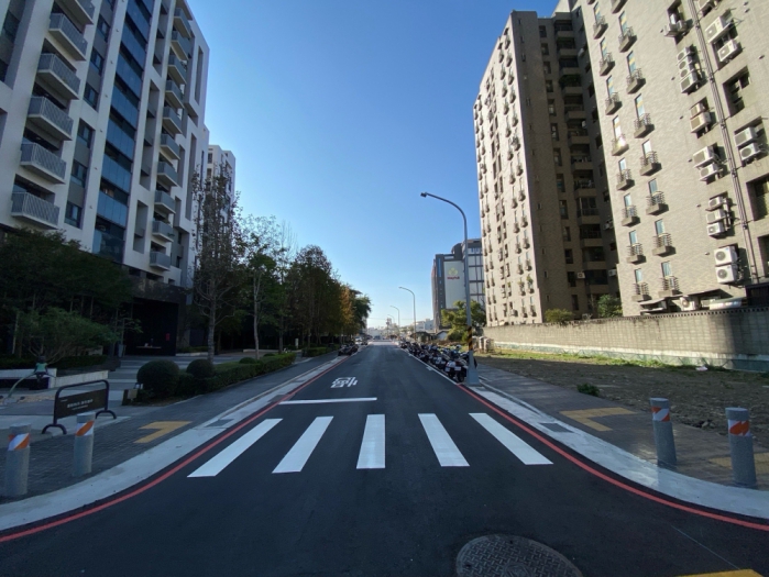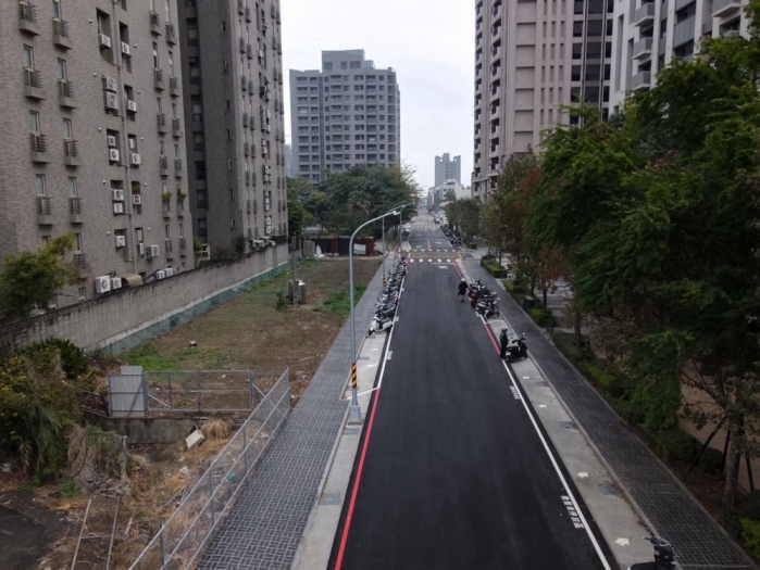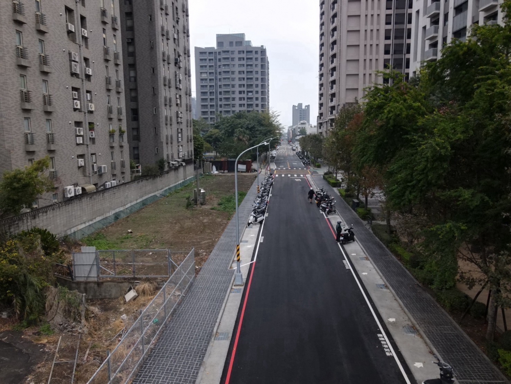 開工前現況道路寬約7公尺,僅單邊設有人行道,且因設置機車停車格,導致人行空間縮減,又未串連至鄰近公園等開放空間,造成地方居民長期行走空間受阻,此次道路開闢工程完工,將串連周遭行人動線,提供民眾舒適、安全的通行環境。