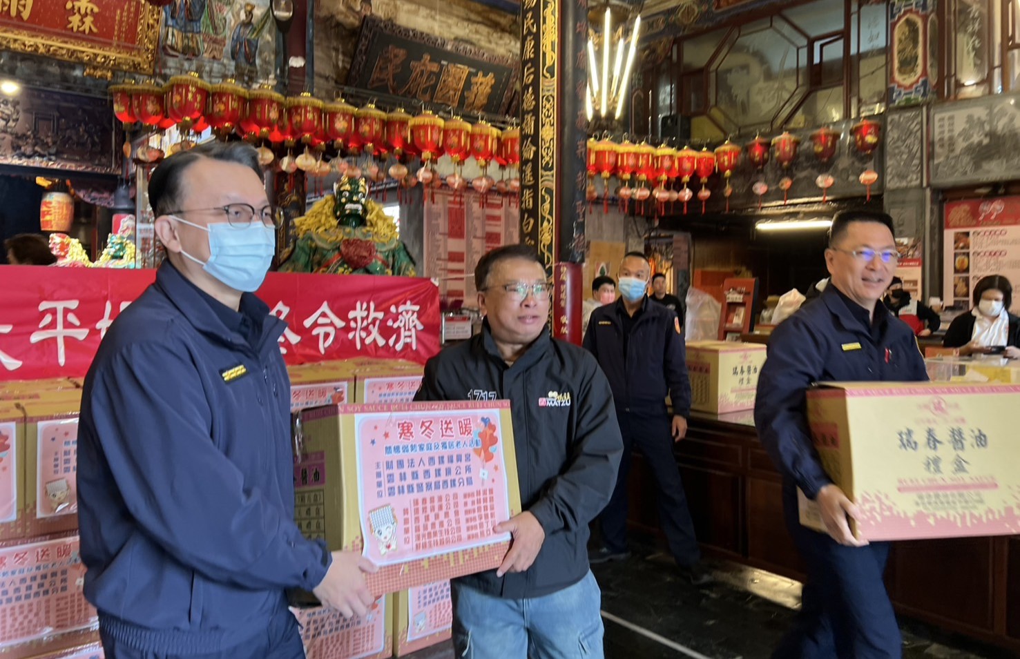 福興宮提供了包含米、麵、罐頭等基本生活物資,逐一送到轄內弱勢家庭與獨居長者手中,並由員警親自協助分發:。(圖/記者蘇峯毅翻攝)