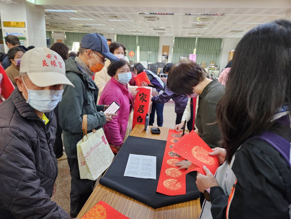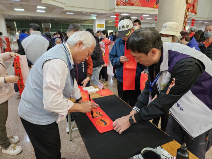 大甲區長顏金源表示,貼春聯賀新年是春節不可或缺的傳統習俗,而書法不僅是傳統國粹,更是文化的傳承與藝術的體現,為鼓勵市民更瞭解傳統書畫藝術,在春節前夕公所透過揮毫贈春聯活動,除讓民眾感受濃厚的年節喜慶氛圍外,也能盡情感受書藝的魅力,並希望所有的吉祥祝賀語都能化作祝福,傳遞給市民朋友,為家園增添祥瑞及喜氣。
