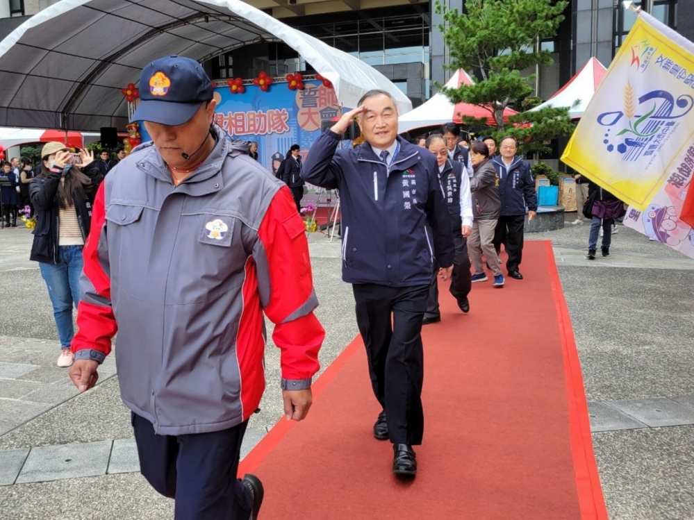 副市長黃國榮在民政局長吳世瑋及警察局副局長林逢泉陪同下校閱代表里隊,除為隊員加油打氣外,也逐一頒贈慰勞金慰勉各里隊辛勞,讓台中成為更友善安全、幸福宜居的城市,並祝賀大家新年快樂、蛇蛇(事事)如意。