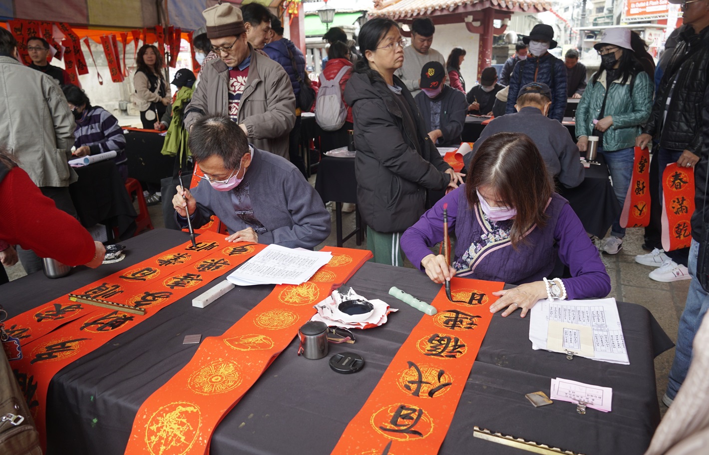 50位書法大師輪番上陣,於廟埕前為民眾書寫春聯,贈予吉祥與祝福。