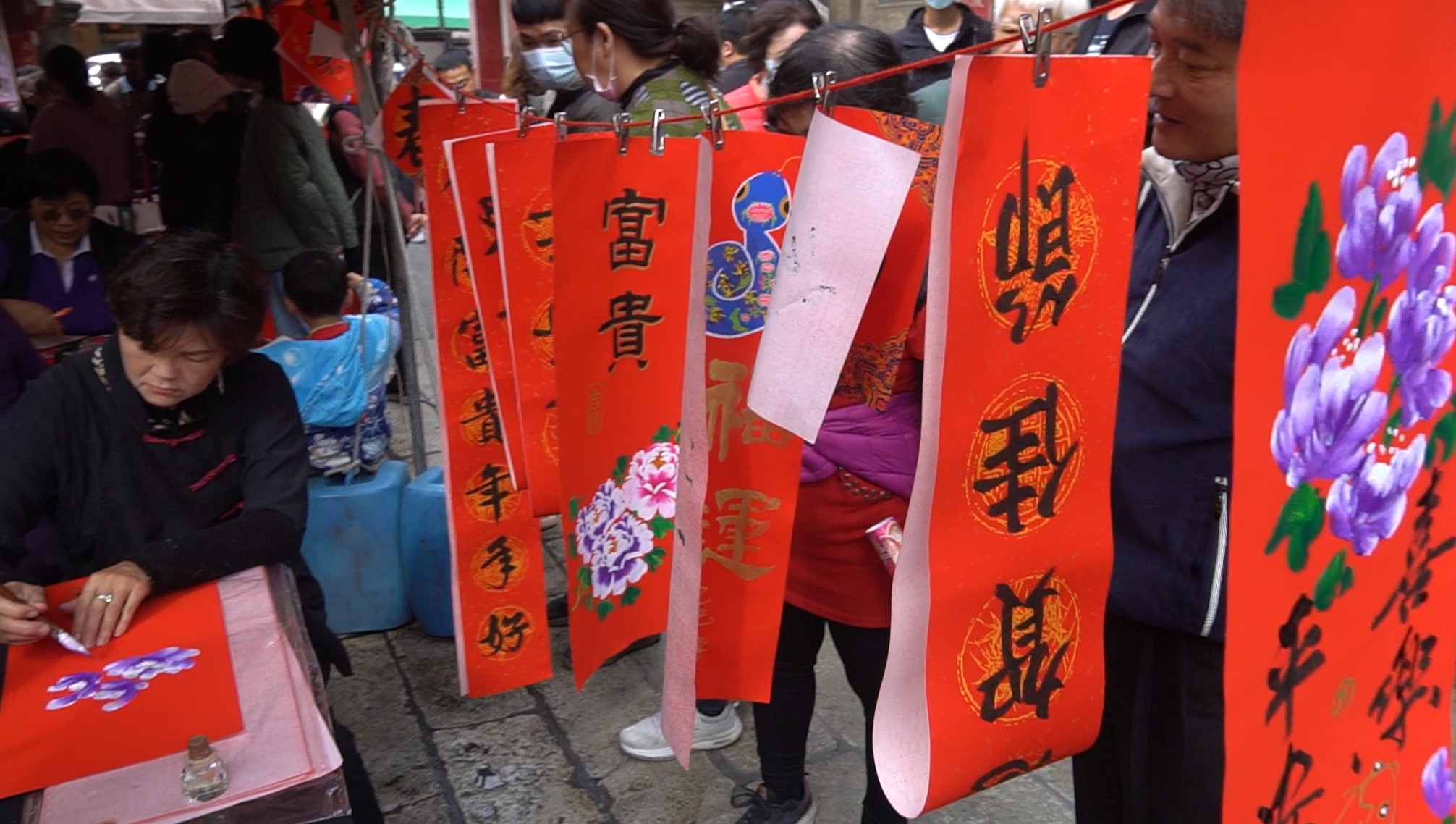 北港朝天宮廟前廣場由50位書法大師現場揮毫,擠爆索取春聯及年畫的人潮。