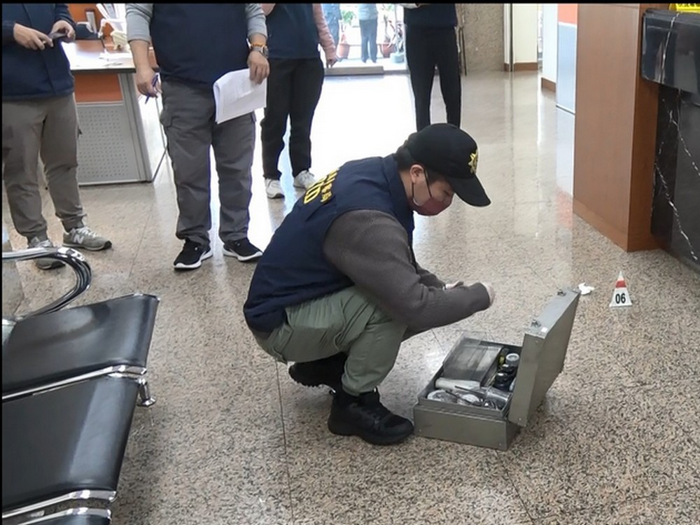 竹崎警分局說明演練狀況,為有1名歹徒持手槍(戴口罩)闖入京城商業銀行竹崎分行,搶劫得手後,乘坐另名在外等待之歹徒所駕駛灰色自小客車逃逸,銀行櫃檯行員機警通報警方,分局勤務指揮中心獲報,立即通報線上警網及偵查隊趕赴現場協同處理;並通報各警網實施攔截圍捕及封鎖現場,進行現場及其他偵搜攔截圍捕等作為。