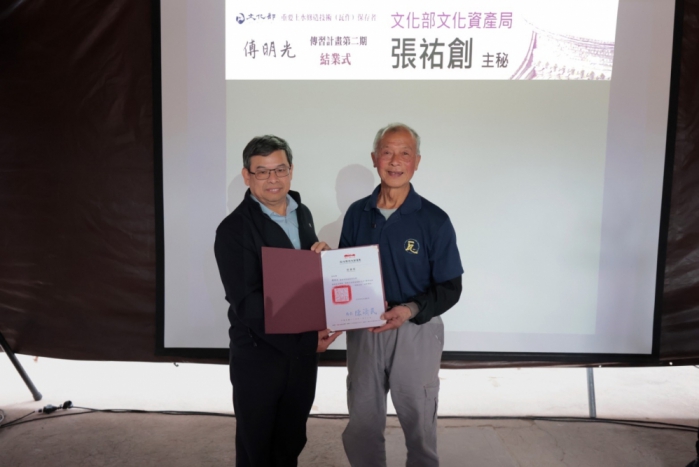 新竹縣政府文化局長朱淑敏也親臨現場,向傅明光司阜致意,感謝傅司阜將客庄最傳統古老的建築技藝,手把手傳授給11位學員,除了將沒有防水層的傳統屋面施作工法保留下來,也期許這些學員能夠在未來的文化資產修復場域,成為一支堅強的生力軍。