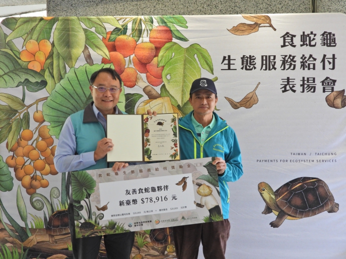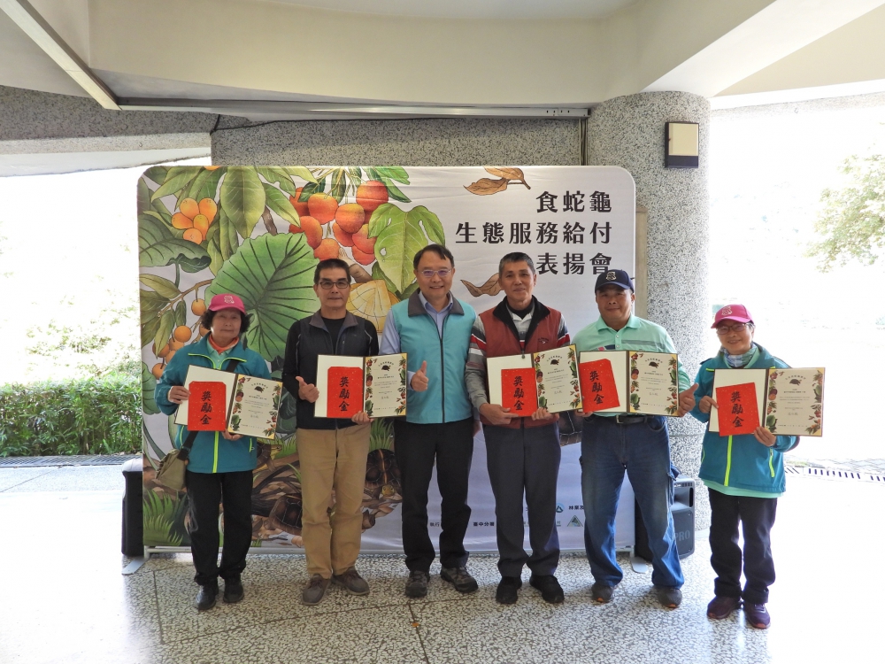 為減緩食蛇龜生存壓力,該分署積極盤點潛在棲地,以台中太平、霧峰地區大面積種植龍眼、荔枝、枇杷等果園,為食蛇龜喜好利用之棲地類型,以「友善農地給付」、「巡護監測給付」兩種給付項目,依所實際執行的農地友善管理、營造適宜棲地、社區巡守及保育宣導等作為,每人每年可核發上限3萬元獎勵金,鼓勵農友們為食蛇龜維護良善的棲地環境。