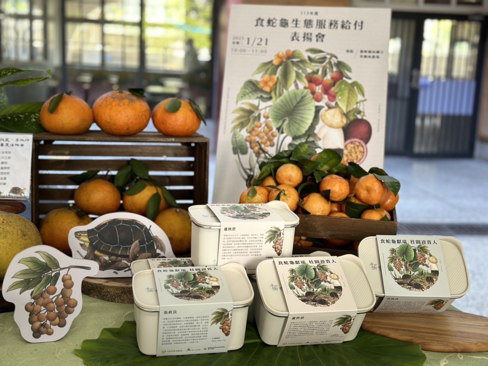以友善食蛇龜果園產製的桂圓,象徵「貴人守護」肯定在地夥伴為食蛇龜棲息環境的付出。(記者張原銘攝)