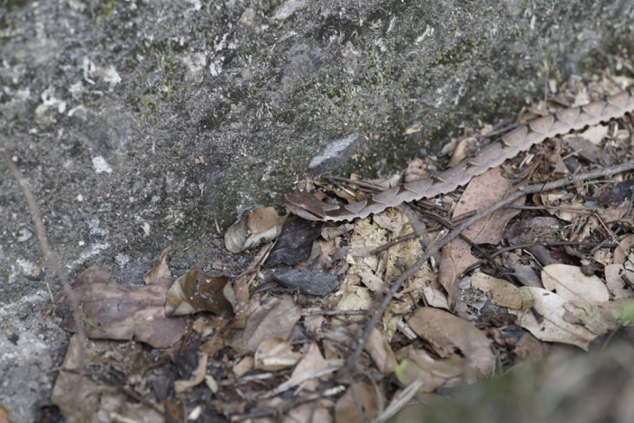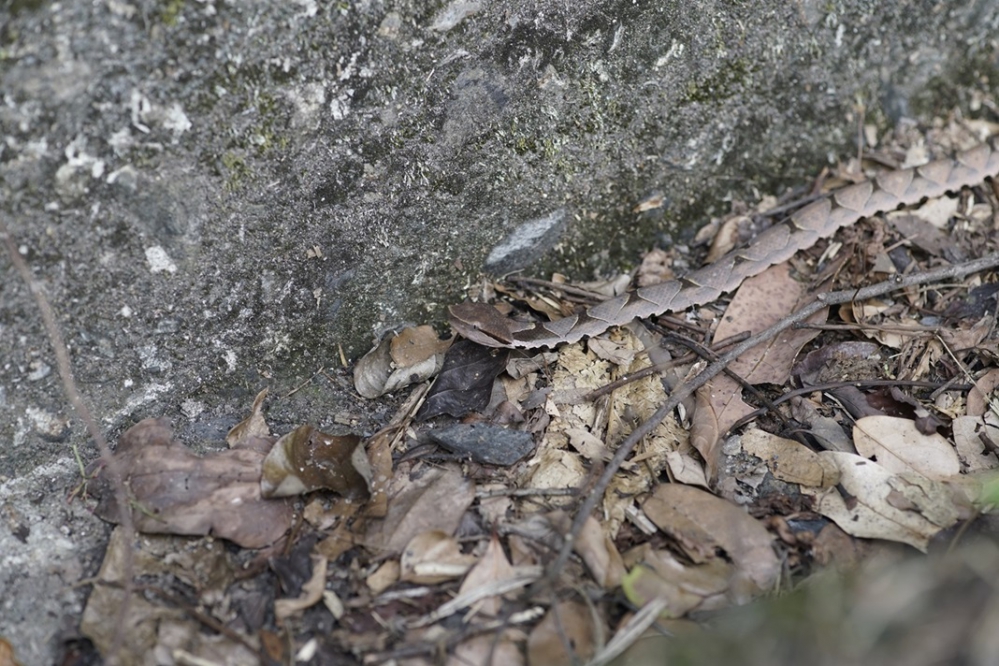 另外,研究人員在追蹤的過程中,在附近也發現另外1條百步蛇幼蛇,經花紋比對確認為同一批孵化的幼蛇,顯示母蛇繁殖地點的選擇,除了考量護卵過程所需的環境以外,同時會選擇適合幼蛇離巢後利用的棲地環境,這些發現為野外百步蛇生態研究展開新的里程碑。