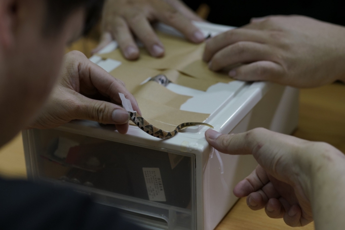 【記者張原銘、張皓傑台中報導】林業及自然保育署臺中分署去年6月發布「守護:百步蛇野外護卵孵化記錄」影片,記錄八仙山國家森林遊樂區內全球首筆野生百步蛇護卵、孵化及護幼過程,獲得廣大迴響。就在幼蛇孵化後1年,該分署又於園區內發現百步蛇幼蛇身影,經比對確認是影片內記錄到母蛇所產下的幼蛇之一,立即把握珍貴的機緣,再次對幼蛇進行追蹤,並透過形質測量發現,幼蛇體長從27.99公分增長為34.58公分,體重也從16.65公克增加至23.14公克,累積更多百步蛇野外生態資料,趁著迎接蛇年到來時,公開寶貴資料與民眾一同分享。