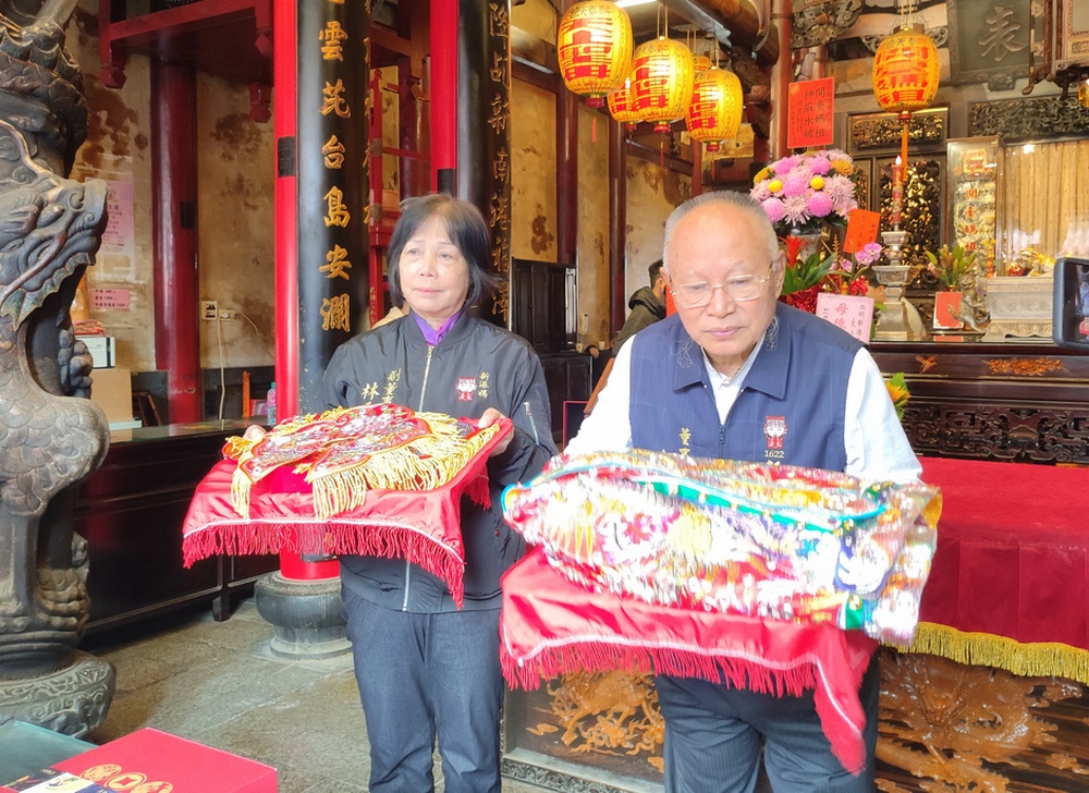 奉天宮董事長何達煌擲杯徵求開臺媽祖同意下,隆重為媽祖舉行「洗塵與赦香條」儀式。(圖/記者任芳葵攝)本次更為開臺媽祖換上由信眾捐獻的「全手工全蔥媽祖神袍」及「全手工神帽」,特別聘請國內知名,嘉義宥弘繡彩行劉俊男、劉恩佑、羅春娥、彭景聖四位師傅攜手合作,及紙藝大師蔡承哲製作神帽,所費不貲,讓開臺媽祖能漂漂亮亮出巡繞境賜福平安,也希望本土傳統繡品及紙藝文化得以傳承永續。