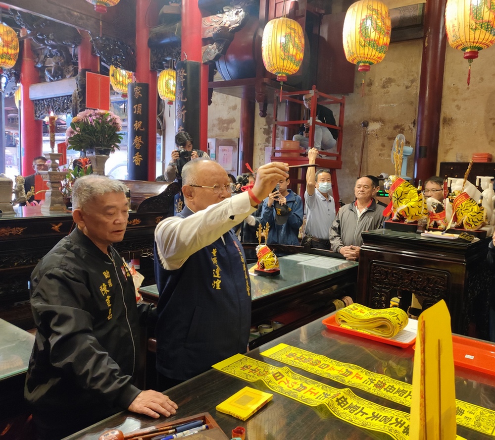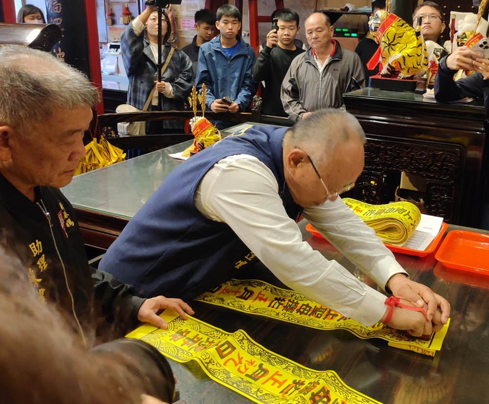 奉天宮董事長何達煌隆重為媽祖出巡香條用印。(圖/記者任芳葵攝)今年又逢新港奉天宮開臺媽祖駐台404週年,更是新港奉天宮恢復十八庄繞境的50周年,奉天宮今年特別按照古香路的遶境範圍舉辦,一來為台灣這塊土地賜福,二來慶祝奉天宮恢復十八庄繞境的50周年紀念。