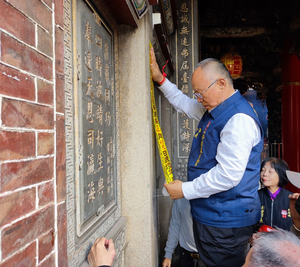 奉天宮董事長何達煌隆重貼香條。(圖/記者任芳葵攝)