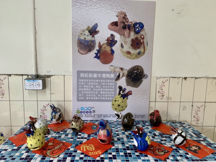 在陶藝家李承恩及白宗平老師的指導下,中港高中美術班學生創作出多件以蛇年為主題的「萌蛇彩蛋」陶塑作品及繽紛陶杯,並搭配手繪蛇年春聯,展現濃厚的年節氛圍。