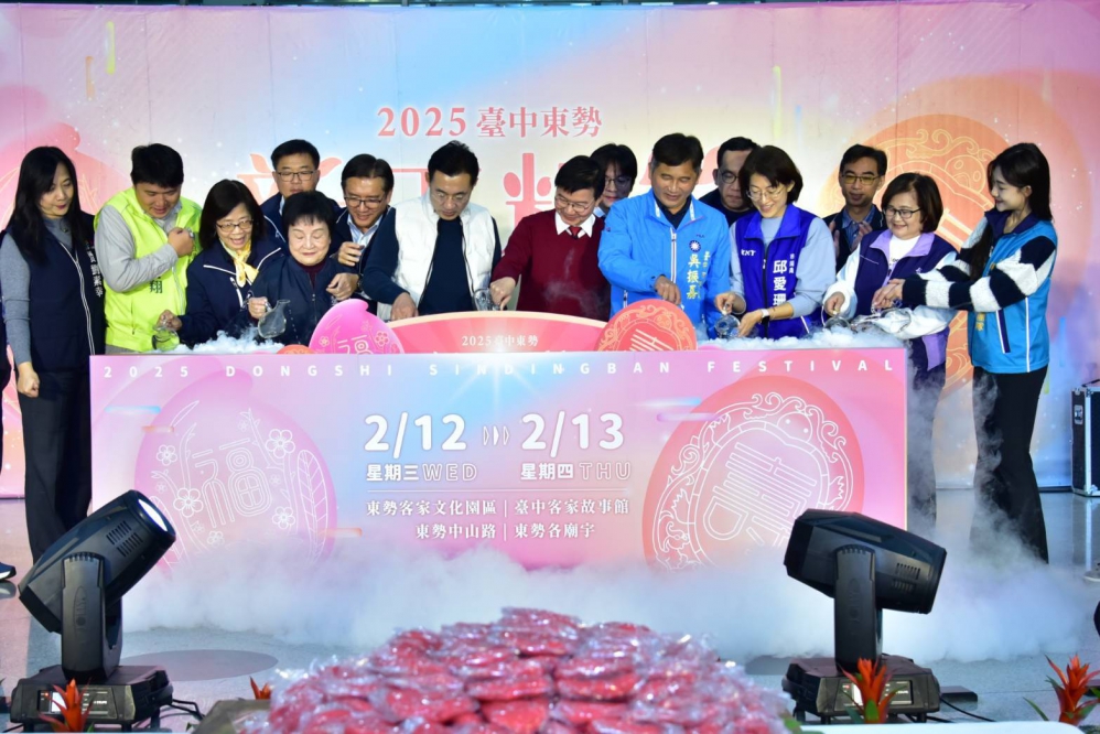 現場由客委會主委江俊龍帶領來賓於啟動裝置中注入活水,宣告「2025台中東勢新丁粄節」隆重登場,正式邀請全國民眾「正月半,來東勢,食大粄」。立法院副院長江啟臣、市議員張瀞分、吳振嘉、邱愛珊、古秀英、水利局長范世億、地方稅務局長沈政安、法制局長李善植、運動局長游志祥、研究發展考核委員會主任委員劉彥澧、數位發展局主任秘書沈志蒼、經濟發展局專門委員林敏棋、建設局山線工程隊長蔡榮峯、工商發展投資策進會副總幹事王文興、和平區長吳萬福、豐原區長洪峰明、石岡區長劉素幸、新社區長林淑惠、東勢區公所主任秘書林豪爵、和平調解委員會主席鄒盛達、市政顧問謝孝杭、林作高、劉志宗和多位里長及校長皆到場共襄盛舉。