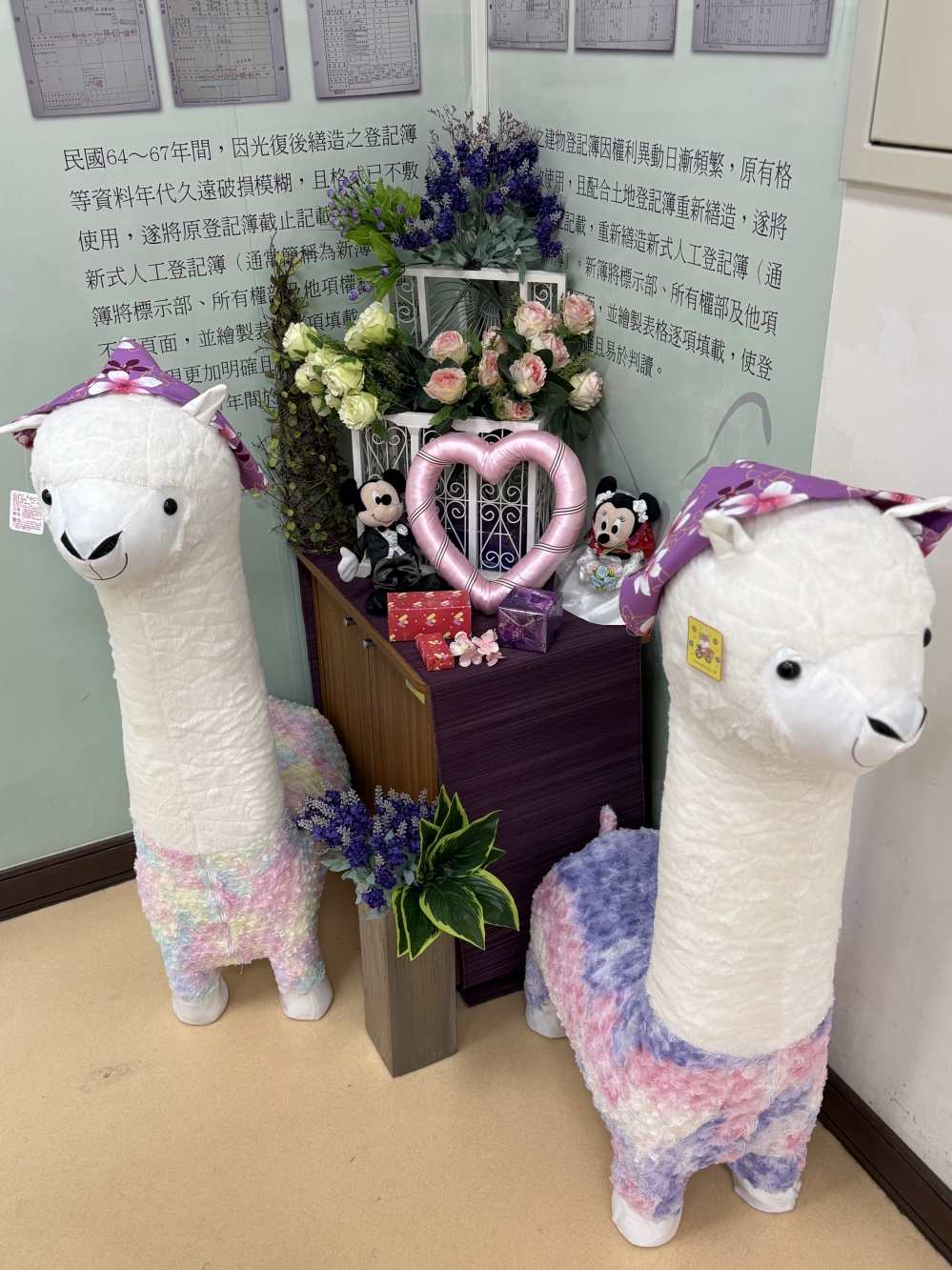 地所同仁特地裝飾浪漫童話風格領取權狀拍照牆,讓拍照的民眾幸福感洋溢,另外樓梯間也有小朋友最愛的茗茶體驗區,亦有接到洽詢可否借景拍攝婚紗照的電話,東勢地所都非常歡迎大家運用,或先至地政事務所網站線上檔案展一窺究竟。