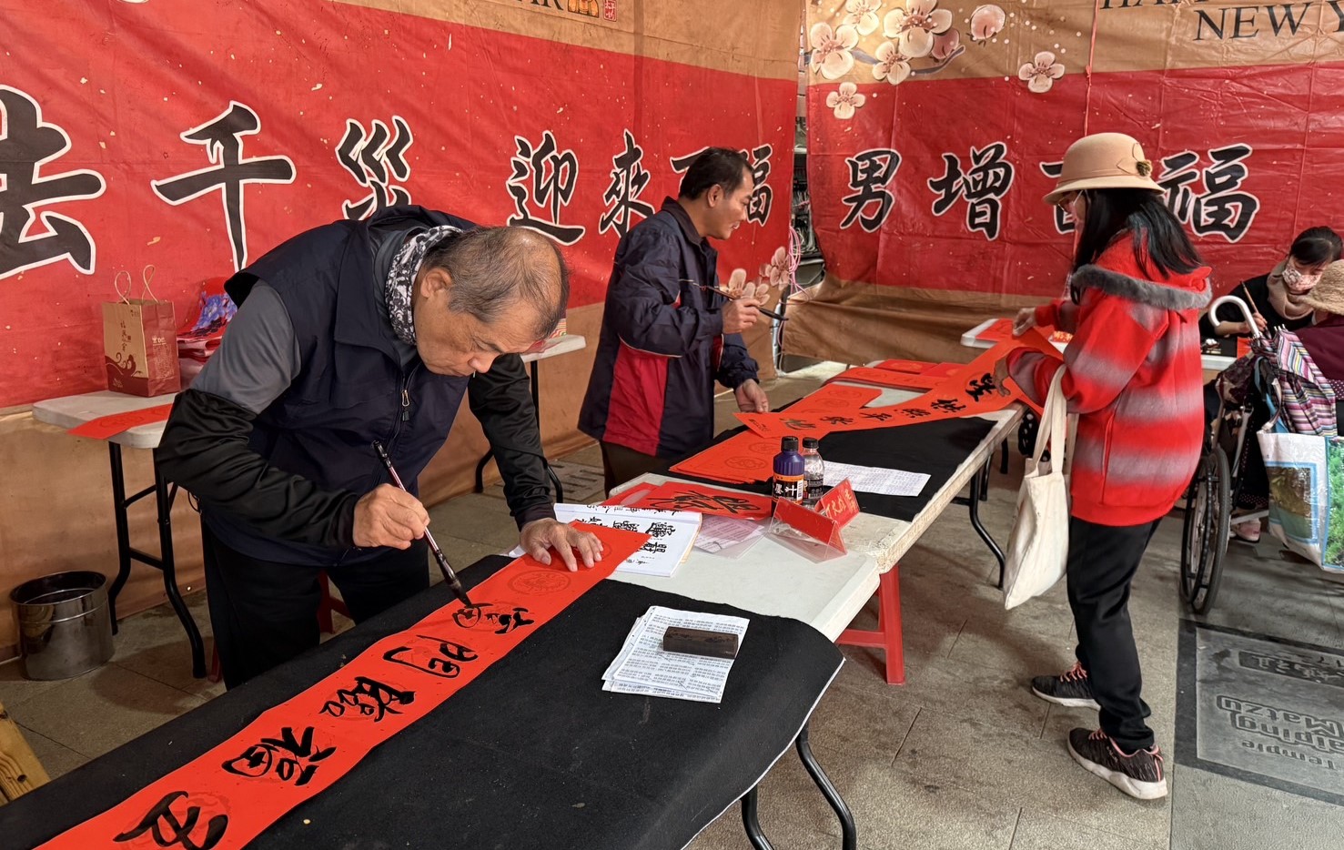 現場由書法家洪政煌、許阿巧及多位國畫藝術家即席揮毫,創作出寓意吉祥的春聯、門聯及年畫,免費贈送。(圖/記者蘇峯毅攝)
